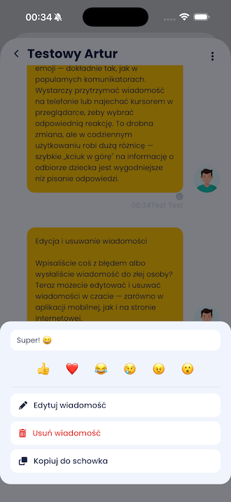 Komunikacja między rodzicami a wychowawcami stała się bardziej naturalna. Na wiadomościach w czacie można teraz zostawiać reakcje emoji — dokładnie tak, jak w popularnych komunikatorach. Wystarczy przytrzymać wiadomość na telefonie lub najechać kursorem w przeglądarce, żeby wybrać odpowiednią reakcję. To drobna zmiana, ale w codziennym użytkowaniu robi dużą różnicę — szybkie „kciuk w górę" na informację o odbiorze dziecka jest wygodniejsze niż pisanie odpowiedzi.